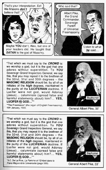Mr. Jack Chick showed some clever originality in his use of the bogus Albert Pike "quote" in the 1991 edition of his comic book, The Curse of Baphomet. Rather than plagiarizing Lady Queenborough, as have so many of his allies, he used a fictitious reference to a legitimate publication: "'The Freemason' (the organ of English Freemasonry), 19th January, 1935"!(9) Although he has removed the fictitious reference from current editions, the bogus quote remains.