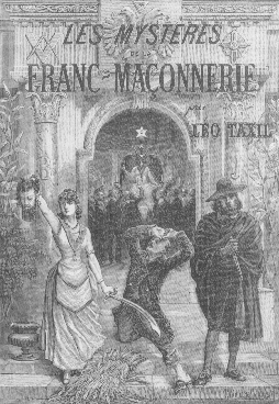 Figure 3. Cover of The Mysteries of Freemasonry, another of Taxil's anti-Masonic Books. The cover is typical of the lurid illustrations used to attract readers to the scurrilous "revelation" of Masonic Lodge activities. |